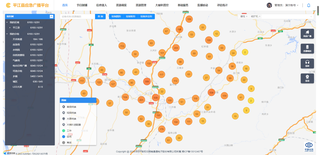 結合平江縣社會治理實際需求,特別在汨羅江平江縣城段流域增設一江兩岸禁漁禁捕、防溺水廣播點位;在平江縣城區主干道十字路口增設城市文明創建廣播點位;在平江縣境內尾礦庫增設預警廣播點位。此外,還增設了水庫監測廣播點位、地質災害廣播點位、戶外LED廣告大屏廣播點位,充分發揮多種社會治理場景下應急廣播的指揮調度和信息發布作用。