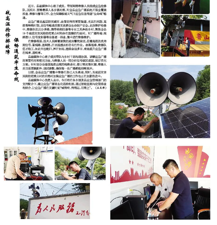 近日,縣融媒體中心班子成員,帶領(lǐng)網(wǎng)絡(luò)維修人員組成應(yīng)急搶修隊(duì),頂烈日、冒酷暑深入各鄉(xiāng)鎮(zhèn)村落,對(duì)全縣應(yīng)急廣播系統(tǒng)開(kāi)展全覆蓋排查、維修與督導(dǎo)工作,全力保障極端天氣下應(yīng)急信息傳遞“生命線”暢通。
