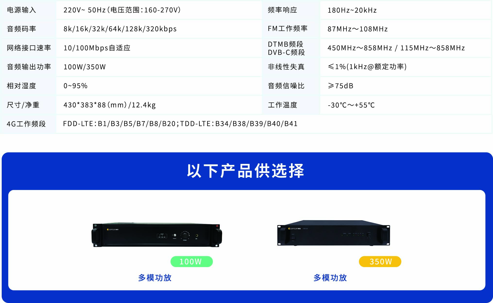 多模功放主要應(yīng)用于大功率廣播場景,支持接收應(yīng)急廣播指令并解析其中音頻信號放大輸出至喇叭,同時可進(jìn)行本地擴(kuò)聲。整機采用全金屬設(shè)計,防腐防潮。產(chǎn)品支持IP 、TS 、 FM 和 4G 四種接收模式(可根據(jù)場景,選配模式),可外接高音號角或者模擬音柱等發(fā)音單元,輸出功率最高可達(dá)350W。