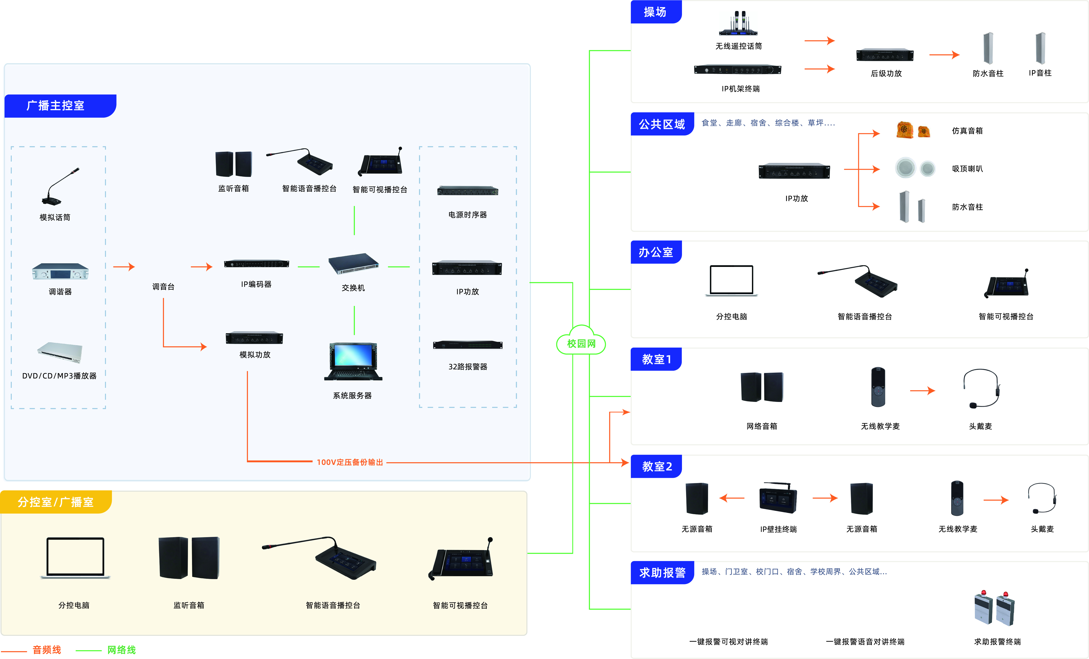 星云IP廣播系統基于信息共享、資源整合、集中管理、服務良好等原則,全方位實現校園信息化廣播系統需求。通過星云廣播軟件設置,既可全校范圍內統一集中控制管理,又可各分區獨立管理。接入校園網的電腦均可作為校園廣播系統的分控點,可在教師辦公室、學生處、領導辦公室等設置廣播分控工作站。可對校園內的教學樓、綜合樓、食堂、宿舍及操場等區域進行分區管理或統一控制,配套采用不同場景下揚聲器等設備,可覆蓋整個教學功能區及校園內聲場,超越傳統的教育模式,實現無人值守的校園數字自動化廣播功能,提高綜合辦學質量和效益。