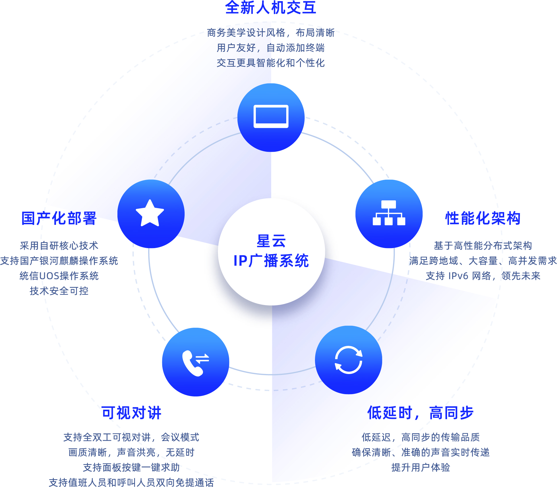 星云IP廣播系統支持多操作系統,包括Windows,Linux,國產麒麟操作系統,兼容性與安全性更高,支持多級管理與系統級無限擴展。支持多種部署方式,包括公有云,私有云,以及專網部署。系統安裝、使用和維護簡單,只需將終端接入計算機網絡即可構成功能強大的數字廣播系統,多方面體現了其顯著的優越性。